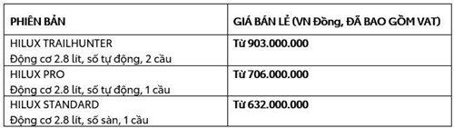 Nhằm đáp ứng tối đa nhu cầu sử dụng ngày càng đa dạng của nhiều nhóm khách hàng khác nhau, với Hilux thế hệ thứ 9, Toyota chính thức giới thiệu 3 phiên bản được phát triển theo những định hướng rõ ràng về công năng và phong cách, bao gồm: Hilux Trailhunter 2.8 4x4AT, Hilux Pro 2.8 4x2AT và Hilux Standard 2.8 4x2MT. Mỗi phiên bản đều được tinh chỉnh để phù hợp với từng mục đích sử dụng cụ thể, từ chinh phục địa hình, phục vụ công việc hằng ngày cho đến đáp ứng nhu cầu di chuyển cá nhân, qua đó mang đến cho khách hàng nhiều lựa chọn linh hoạt trong hành trình đồng hành cùng Hilux thế hệ mới.